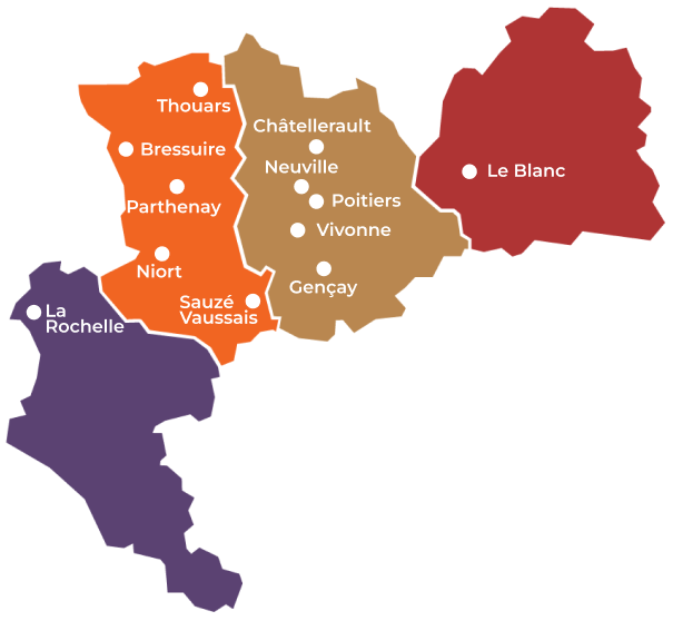Né il y a plus de 20 ans du rapprochement de deux cabinets régionaux, nous poursuivons notre développement tout en continuant à préserver notre volonté de rester un cabinet de proximité ! Fort de notre maillage territorial, le groupe compte désormais 8 sites principaux : Poitiers, Niort, La Rochelle, Thouars, Bressuire, Parthenay, Châtellerault et Le Blanc. Et également présent à Neuville, Gençay, Sauzé-Vaussais et Vivonne. Des implantations dont nous sommes fiers et au niveau desquelles nous nous investissons quotidiennement dans la vie locale.